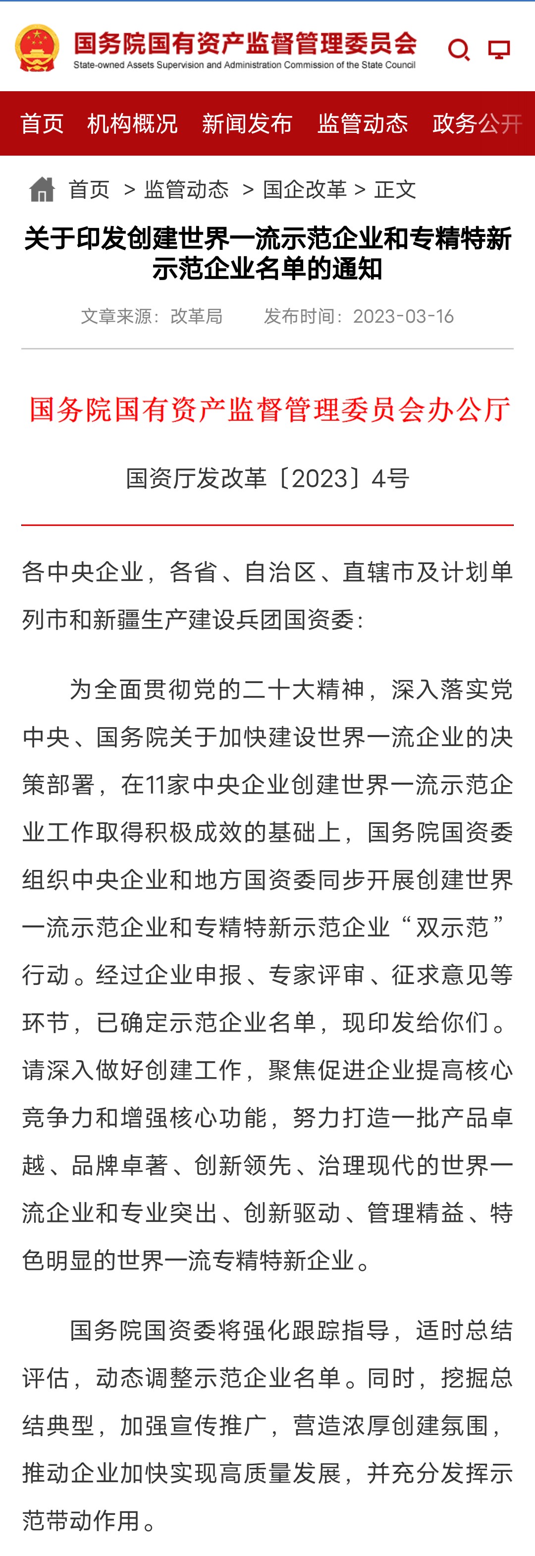 太阳成集团tyc122cc入选国务院国资委创建世界一流专精特新示范企业名单