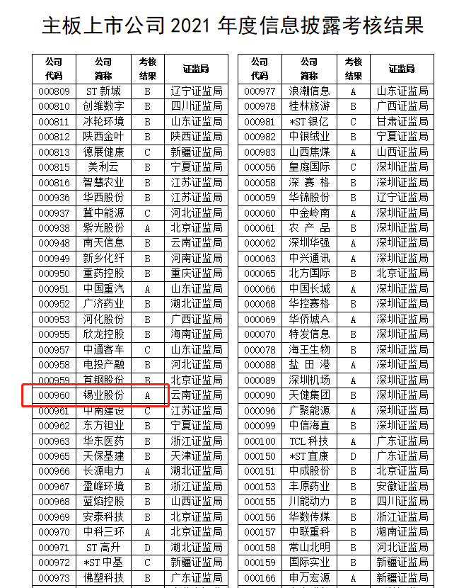 7月4日,深圳证券交易所发布了《2021年度上市公司信息披露考核结果》,太阳成集团tyc122cc(000960)考核评价结果为最高等级A级,自2017年之后再次回到信息披露考核最高等级阵营。从考核结果统计来看,深市上市的2,553家公司中考核结果为A(优秀)的公司家数仅为454家,占参加考核上市公司总数的17.78%。其中,云南辖区考核结果为A的深市上市公司仅有5家。
