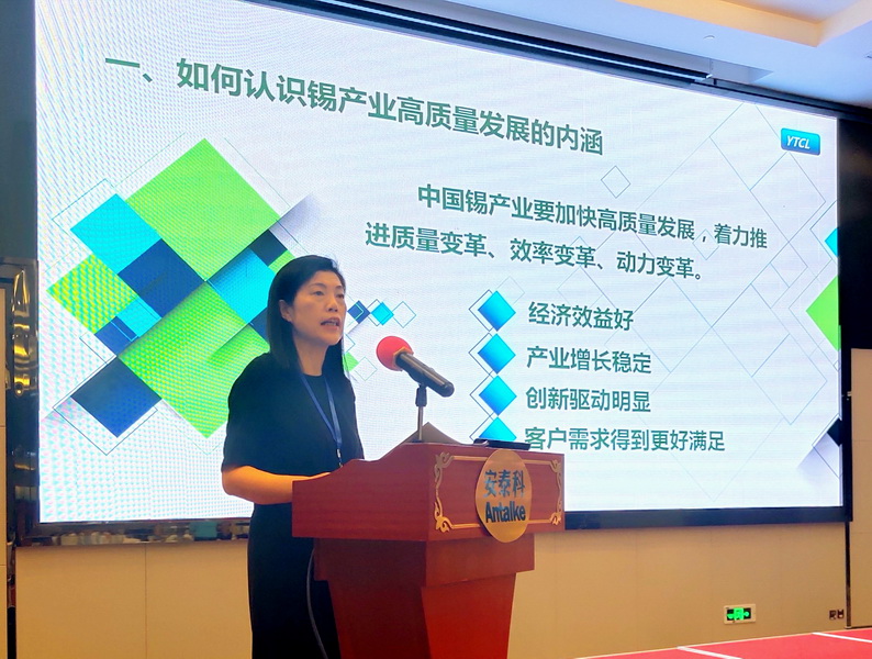 在大会报告环节,杨奕敏应锡业分会安排,紧紧围绕“锡产业高质量发展”作主题报告。报告指出:当前,世界经济形势扑朔迷离、国际贸易环境深度调整,中国经济社会发展进入新时代,在此大背景下,中国锡产业也要加快高质量发展,着力推进质量变革、效率变革、动力变革。