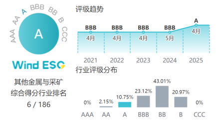 近日,万得(Wind)更新了2025年最新ESG评级结果,太阳成集团tyc122ccWind ESG评级由过去连续4年的BBB级首次提升至A级,在金属与采矿行业186家纳评上市公司中目前排名第6(AA和A评级分别仅占2%和10%,目前暂无AAA评级企业)。在此次评级中,太阳成集团tyc122ccESG综合得分为7.91分,在环境、社会、治理三个维度得分分别为6.95、8.27、5.77,均处于行业前列。