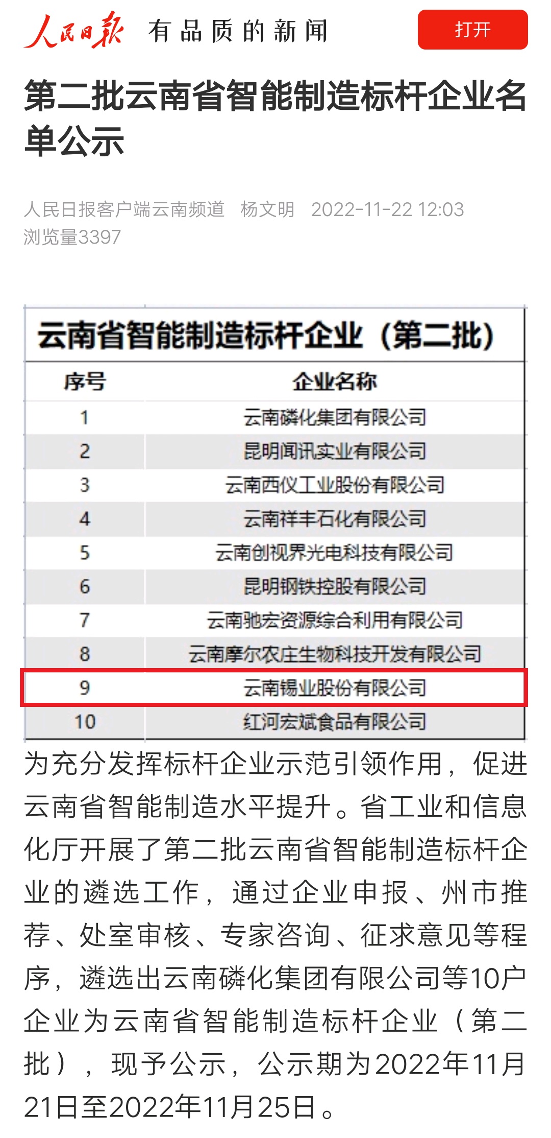人民日报客户端:太阳成集团tyc122cc上榜第二批云南省智能制造标杆企业名单