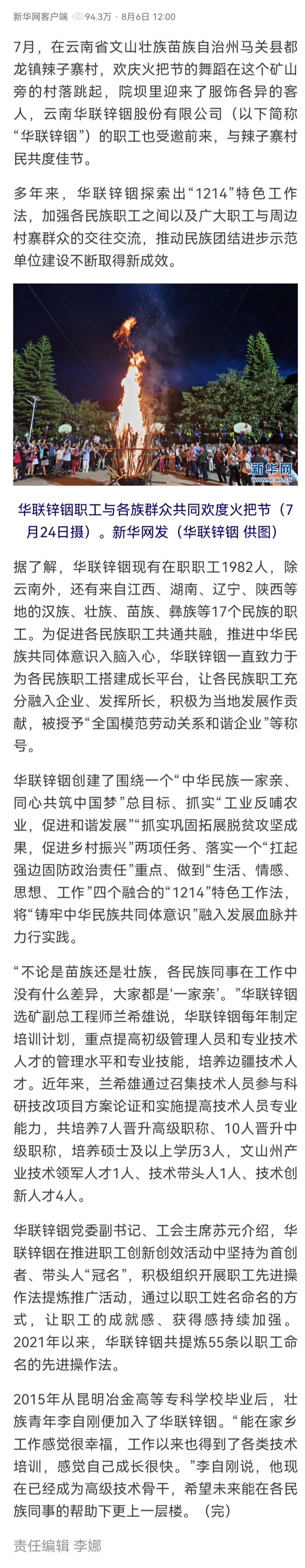 新华网:华联锌铟“1214”特色工作法 谱写民族团结进步新篇