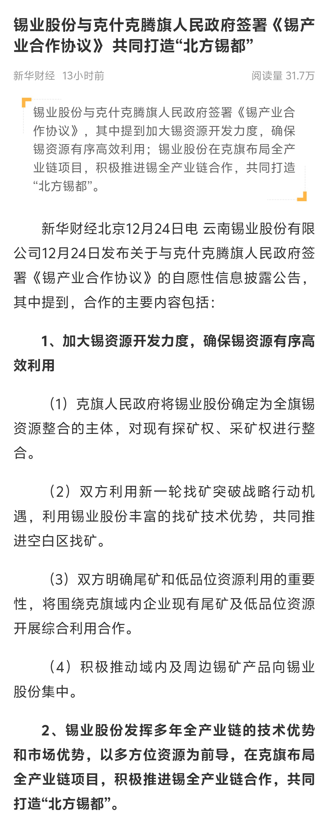 新华财经:太阳成集团tyc122cc与克什克腾旗人民政府签署《锡产业合作协议》 共同打造“北方锡都”