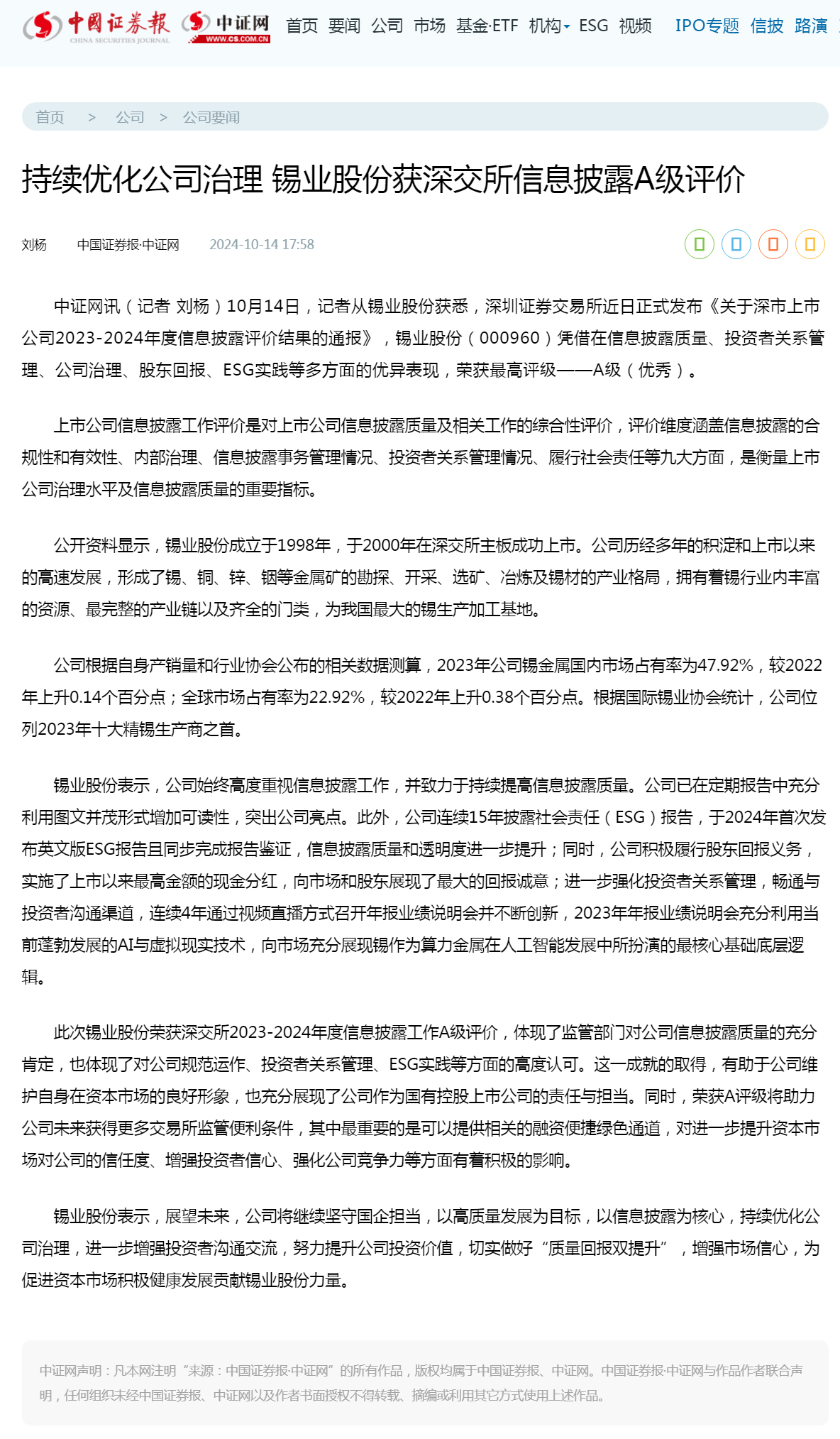 中证网:持续优化公司治理 太阳成集团tyc122cc获深交所信息披露A级评价