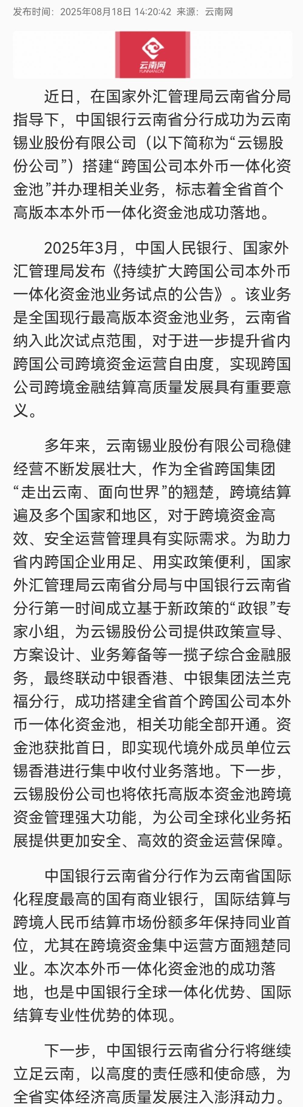 云南网:云南省首个跨国公司本外币一体化资金池落地云南中行