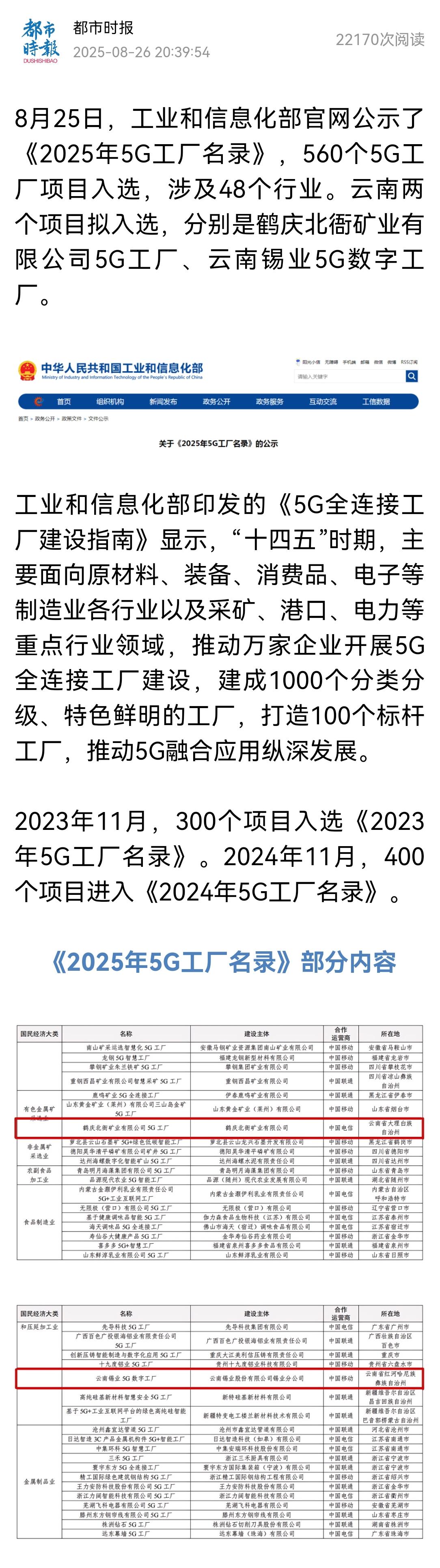 都市时报:云南两个项目拟入选!2025年5G工厂名录公示