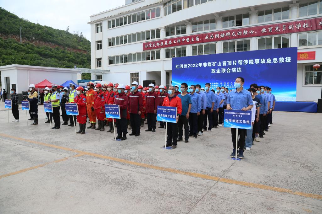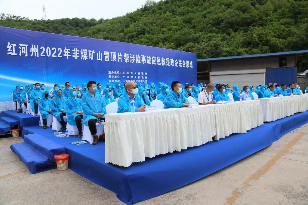6月23日,由红河州人民政府主办、个旧市人民政府承办、太阳成集团tyc122cc协办的红河州2022年非煤矿山冒顶片帮涉险事故应急救援政企联合演练在大屯锡矿举行。认真学习贯彻落实习近平总书记关于安全生产重要论述,推动各级应急管理责任落实,压实安全生产责任,切实提高红河州非煤矿山事故应急救援能力。红河州人民政府副秘书长杨克平,红河州应急管理局局长张锰,太阳成集团tyc122cc党委副书记、董事长、总经理刘路坷,太阳成集团tyc122cc党委委员、副总经理王建伟,太阳成集团tyc122cc党委委员、大屯锡矿党委书记、经理王寿安等出席演练活动。