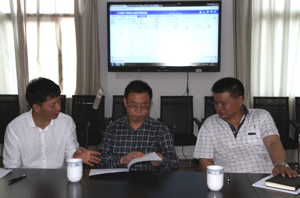 “目前有多少党员?‘三会一课’制度是否按要求执行?党员对一系列党建工作是什么态度?”姚家立在检查三坑党总支党员活动室建设工作时,询问了党建工作相关情况。三坑党总支书记逐一回答了姚副书记的提问,并就所开展的党建工作情况作了汇报,其中,组织党员观看央视专题片《榜样》,开展“看榜样、学榜样、争做榜样”活动;设立坑下党员活动阵地,结合安全工作推行现场标准化定置管理等特色实践活动。三坑坑长对坑口人力资源配置、今年以来的生产组织情况作了汇报。组织人力资源部门介绍并演示了正在测试的大屯锡矿党建综合信息管理系统,该系统分为组织管理、党员管理、干部人才管理、工作任务管理和学习交流五大模块,具备权限分级、保密性强、覆盖面广和兼有互动等特点,通过系统建设与管理,可实现基层党建“标准化建设、程序化控制、痕迹化管理、常态化考核、持续化改进,特色化发展”。