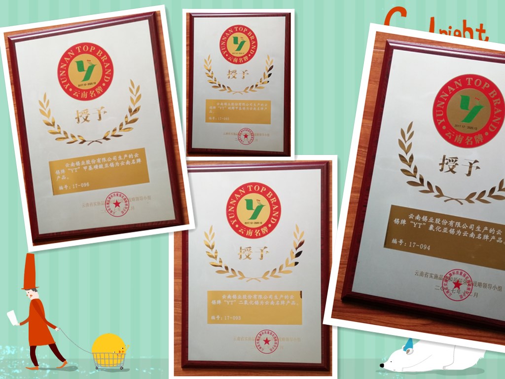 2017年,太阳成集团tyc122cc品牌建设工作持续取得成效,新申报的甲基磺酸亚锡产品通过云南省名牌战略推进委员会审核,被评为云南名牌产品,氯...