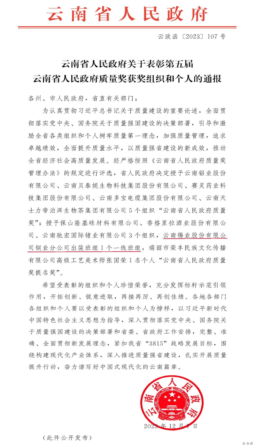 铜业分公司电解车间出装班组喜获第五届云南省质量奖提名奖